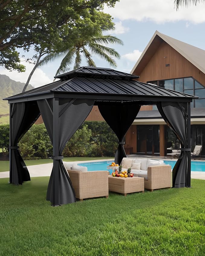 - 【Double-layer Hardtop Gazebo】The galvanized iron sheet on the top of this outdoor gazebo can withstand any weather, extending its lifespan. Rainwater flows into the ground through the eaves' leak holes, reducing the hassle during the rainy season. The double-roof design allows for better ventilation, cooling, and reduced wind stress.