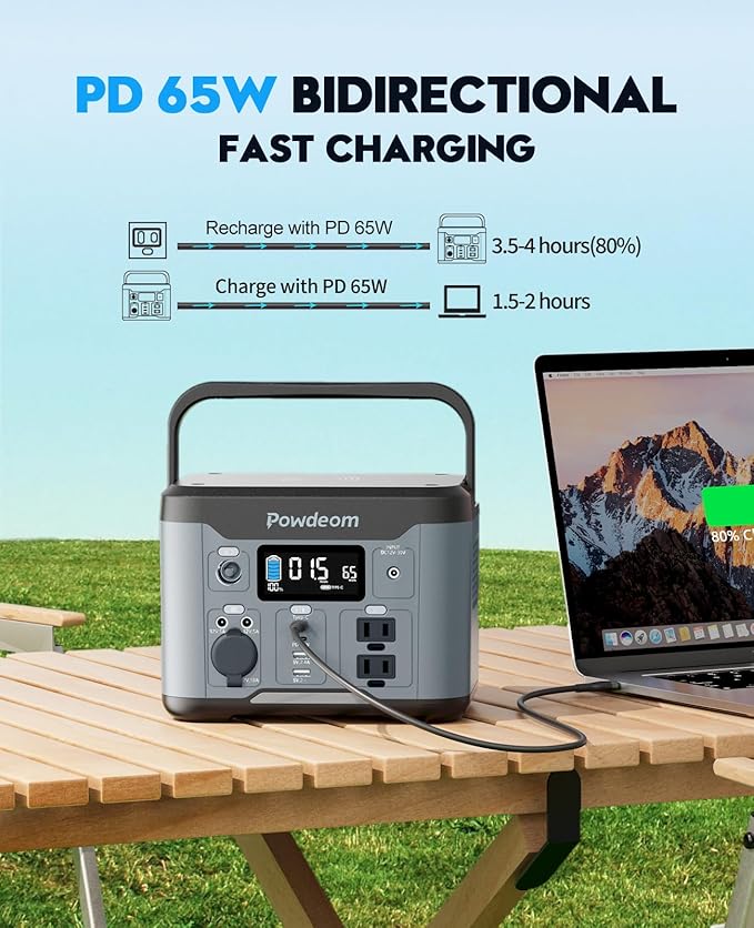 - 5 RECHARGING WAYS: Powdeom power bank with outlet can be recharged by a wall outlet, PD port, car charger or 60w solar panel, even wall outlet and PD port charging together. No matter whether you are outdoors camping, taking a trip, or at home resting, it can be charged and fully used, keeping you stay connected to unlimited energy.