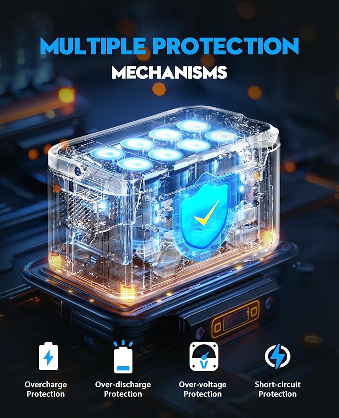- MULTIPLE PROTECTION MECHANISMS: We never compromise on the safety of this battery bank, the built-in Battery Management System ( BMS ) could protect it from over-temperature, over-voltage, over-power, over-current, and short circuits no matter the weather is cold or hot, it is outdoor or indoor.