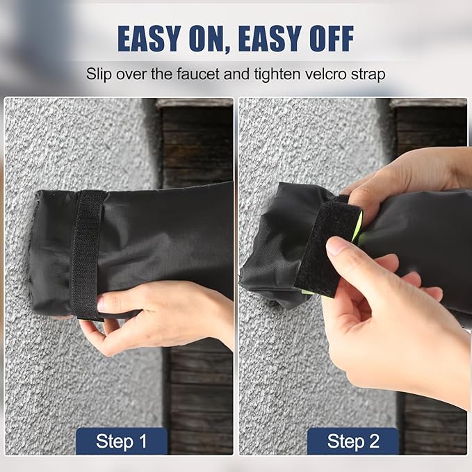 - 🎄Easy To use and Stay Sturdy - Just slide the spigot cover over the faucet, secure with the strips, and you’re done in 3 seconds. No need to worry about the dog chasing it away or the wind blowing it away. More durable and easier to use than some foam covers or hook and loop tape styles.