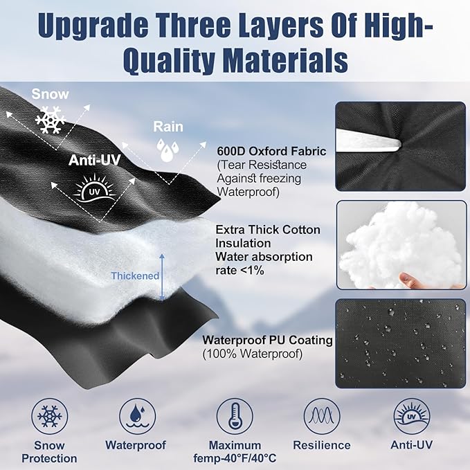 - ☃️Upgrade 3 Layers Thickened Design - Outdoor faucet cover is made of 2 layers of waterproof heavy duty 600D Oxford cloth, 1 layer of thickened cotton insulation. Triple stitching to ensure structural integrity. High strength strap provides maximum security at the bottom, waterproof and insulated to protect against harsh winter weather such as freezing rain and snow.