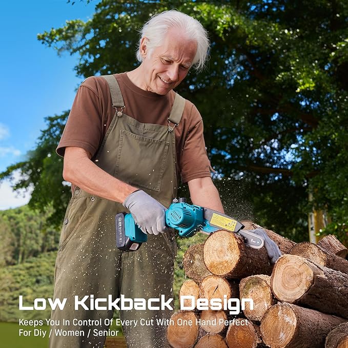 - Enhanced Safety Features: Your safety is our priority. This mini chainsaw includes a dual safety lock system, requiring simultaneous activation of the safety lock and trigger to start. The integrated splash guard also protects against wood chips, ensuring a safer and cleaner cutting experience