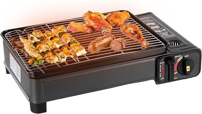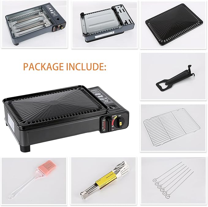 - PORTABLE PROPANE GRILL: Includes BBQ grill, 1 grill tongs, 1 grease brush, grill pan, grill net, pan starter and 6 BBQ skewers, perfect for camping, backpacking, picnics, parties, trailers, parks and more. Gather with family and friends and enjoy outdoor smoky cooking!
