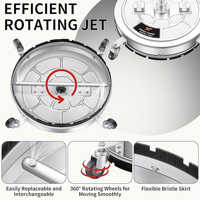 - Surface Cleaner with 4 Wheels - This power washer surface cleaner with 4 wheels that help cleaning process be very easy to maneuver, increase mobility around the job site, it can be flexibly manipulated in a large area. Tough flexible bristles protect adjacent surfaces and resist water splash out while working, make cleaning the driveway and sidewalk an easy chore