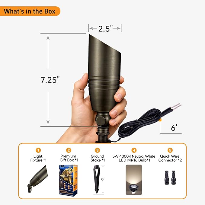 - ๐๐ซ๐ข๐ ๐ก๐ญ: Outdoor spotlight with a 5 watt LED MR16 bulb (450lm). Lights up exterior trees, walls, flags, and fountains up to 10-12 ft. 180ยฐ adjustable while the ground stake stays in place