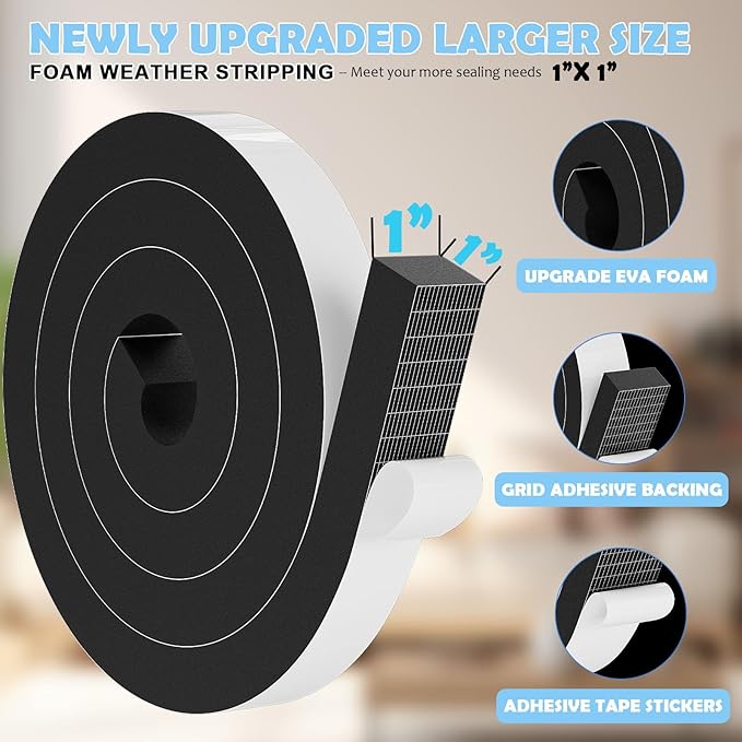 1"×1" EVA Foam Strips with Adhesive Weather Stripping Tape Larger Foam Weather Stripping Strip for Large Gap Insulation (1"×1",13FT,Black)