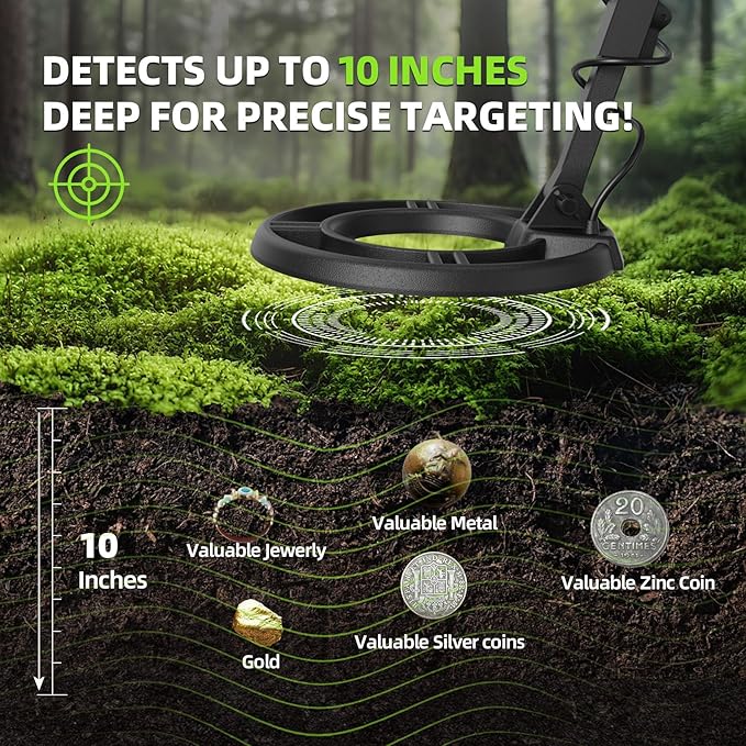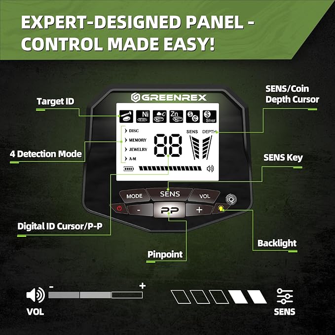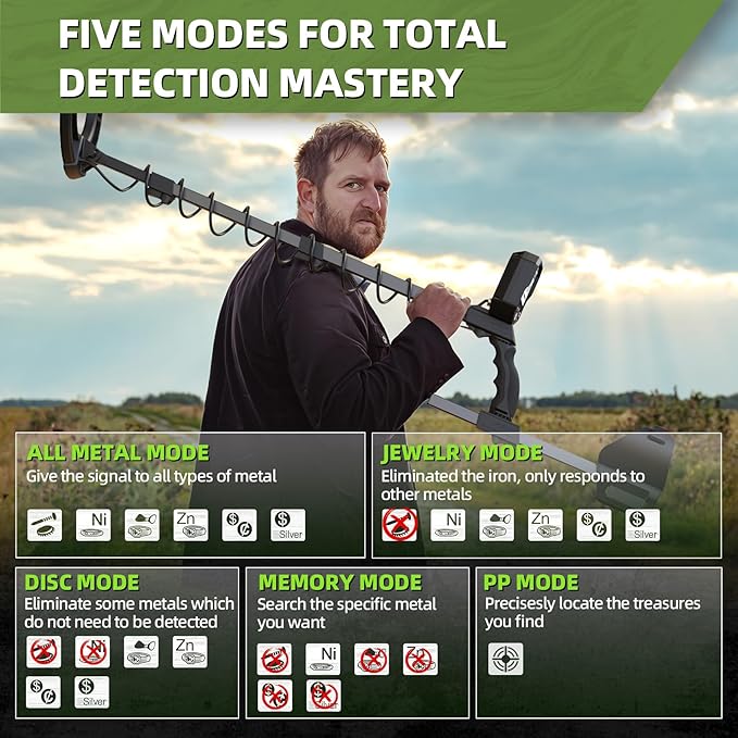- 【5 PROFESSIONAL DETECTION MODES】 The GreenRex Metal Detector features 5 upgraded modes for precise, efficient metal detection. Find coins, relics, jewelry, or gold with our metal detector for adults in less time: ①All Metal: Detects any metal. ②Disc: Ignores unwanted metals. ③Memory Mode: Detects only your chosen metal type. ④Jewelry Mode: Focuses on finding jewelry. ⑤Pinpoint (PP) Mode: Locates targets accurately. An upgraded chip and auto-balance technology allow detection up to 7 inches deep.