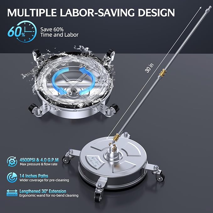 - Simple Connect & Control - Equipped with a 1/4'' quick plug, our surface cleaner easily connects to the included pressure washer extension wands in seconds. With 4 x 360° universal wheels and a 180° swivel bearing, it offers enhanced maneuverability and ease of use, significantly saving your time and energy