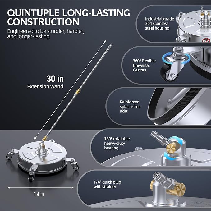 - Quintuple Long-lasting Construction - Constructed from 304 indusrial grade stainless steel housing, heavy-duty bearing, metal jets, 4 enhanced universal wheels and 2 x 15'' extension wands, this well-built pressure washer surface cleaner kit boasts a lifespan of up to 10 years, minimizing maintenance costs