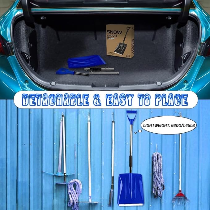 - 【UPGRADED & EXTENDED】The snow scoop is composed of a shovel head and three handles, which can be assembled in two different lengths to meet your different needs. The assembled short size is 33 inches, and the assembled long size is 45 inches.Easy to assemble and disassemble, it won't take up too much space when disassembled and placed in the car. It weighs only 1.45 pounds and is very lightweight to use.