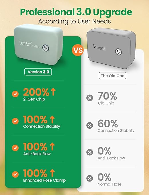 - π₯ [New Upgrades for Superior Performance]: The LetPot automatic watering system now includes an anti-backflow valve to prevent the siphon effect, enhancing watering efficiency. Its upgraded 2.0 chip ensures faster and more stable connectivity, while the LetPot app supports up to 5 simultaneous watering tasks for maximum flexibility. Combined with an advanced spiral lock, it maintains better water pressure retention, ensuring consistent and reliable irrigation every time.