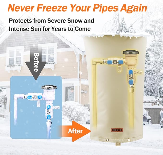 - 【Multipurpose】Our Pipe Insulation Cover works well as a Back Flow Preventer Cover, Sprinkler System Cover, Irrigation System Cover, Well Head Cover Vacuum Breaker Cover, Hose Bib Cover, Well Filter Cover, etc. Protect your device from Severe Snow and Intense Sun.