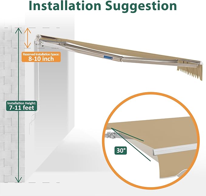 - Adjustable And Retractable Awning : During installation, you can customize the sunshade coverage, and the awning of the patio has an adjustment range of 60°-90°. In addition, just turn the 4.9' hand crank to extend the retractable awning to your desired position to meet your sunshade and rain protection needs.
