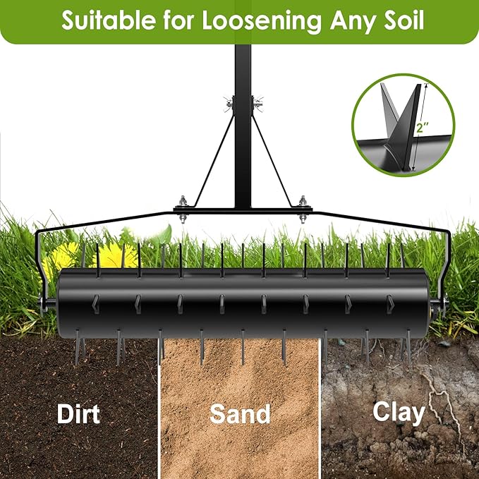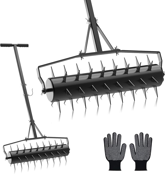- 【High-Quality Workmanship】Our upgraded lawn aerator adopts high-density alloy material, and the inner wall of the aerator is thickened. The surface of the aerator is painted to prevent rust and more durable. The connection between the handle and the roller adopts a stable tripod structure, which is firm, not loose, and not broken. Increased degree of soil turning. Reasonable width and height make your aeration work more efficient and labor-saving