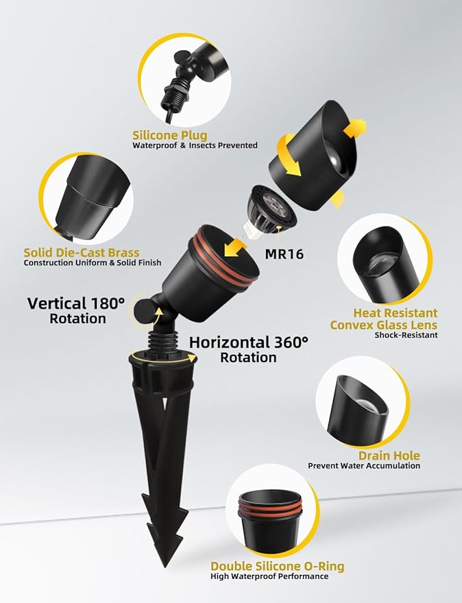- Flexible Installation: Our low voltage landscape light features a cleated heavy-duty stake design, making it easy to mount on the ground. Additionally, there is a screw for adjustment in the middle of the spotlight, allowing you to rotate the outdoor spotlights for yard up to 180° in the vertical direction. These Brass landscaping lights offer a 360° horizontal rotation by adjusting the ground stake. Allows you to illuminate any angle you want without even moving the fixture.