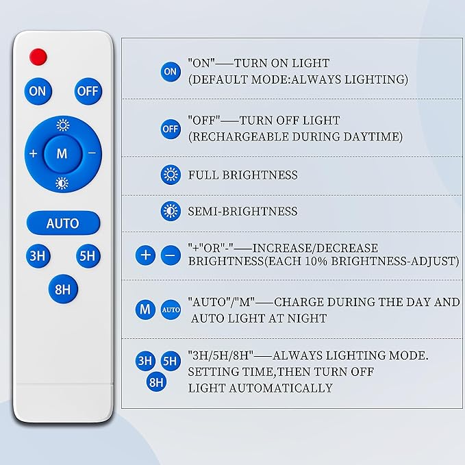 - 【Remote Intelligent Control】:Solar street lights outdoor solar powered have two modes. 1-Dusk to dawn solar outdoor lighting mode: automatically turns on at dusk and off at dawn. 2-Intelligent control: semi/full brightness, time setting(3/5/8 hours,then automatically turn off ), you can set it what your needs(This solar security light without motion sensor mode)
