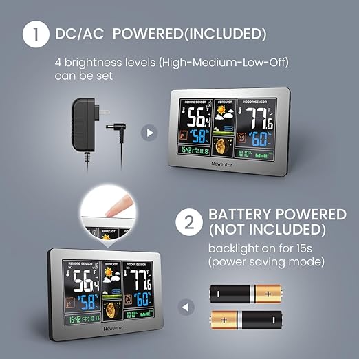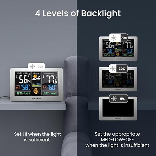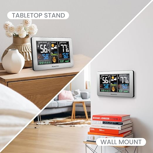 - [7.5" LCD Screen Weather Stations] Newentor temperature&humidity monitor with large color display, which shows comprehensive information: inside outside temperature humidity(max/min, hi/lo), customizable alerts, time/date, alarm clock/snooze, weather forecast (next 8-24 hrs) moon phase, barometric pressure.