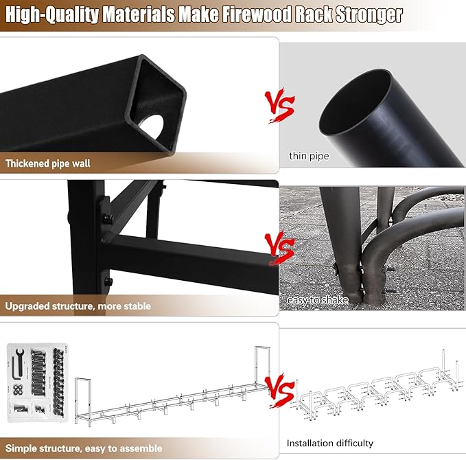 - 🔥STABLE HEAVY DUTY FRAME: Log rack is made of high-quality heavy steel and excellent welding process, with a double black powder-coated finish, for optimal durability, sturdiness. The bottom of wood rack is 4-in from the ground, which helps air circulation, wood won't get wet from being too close to the floor, also makes it easier to clean the area underneath.