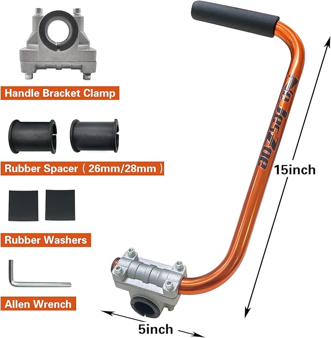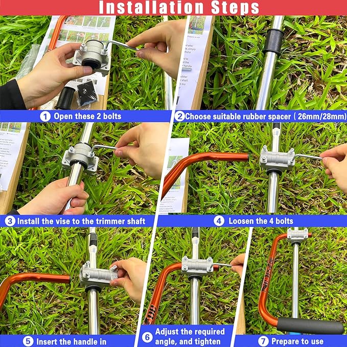 - Easy to Install: We provide installation instruction manual. This for weedeaters handle grip is easy to install on the trimmer shaft. Use the included allen wrench to remove the bolts and vise top, install the vise to the trimmer shaft, use the allen wrench to tighten the vise to where you need it. Note: You can flexibly use the rubber spacer(26mm/28mm) and rubber washers to tighten the bracket clamp on the trimmer shaft.