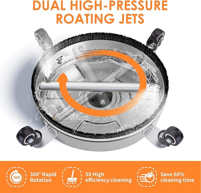 - EFFICIENT PERFORMANCE: Power washer attachment features dual high pressure rotating nozzles that spin quickly to break up stubborn stains on concrete surface, such as driveways, patios, decks, and sidewalks. It cleans up to 5 times faster than standard nozzles, and save cleaning time by up to 60%. Compatible with 2000 psi pressure washer or above, more power will be better cleaning.