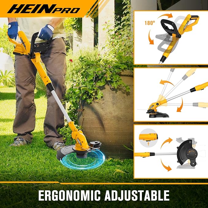 - [Ergonomic Design] HEINPRO electric weed eater is equipped with a 180° adjustable auxiliary handle, and the cutting head is tilted 0-90°. You can adjust the angle according to the space and terrain requirements and complete the trimming easily. The 180° rotating handle provides more options for people who are accustomed to using their left hand.