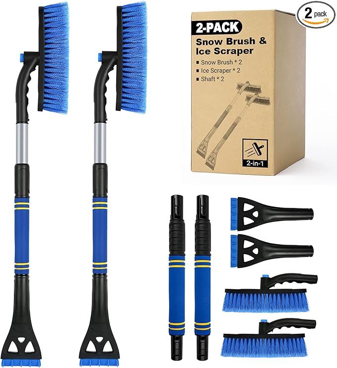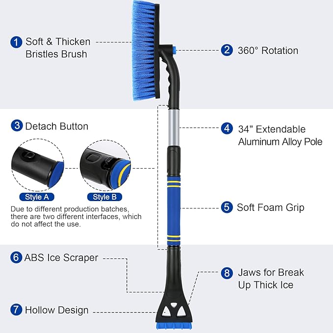 - EASY TO STORE AND SPACE-SAVING: The ice scrapers for car windshields can be easily detached into 3 parts- squeegee/ bristle head snow brush (360° pivoting), ice scraper, and telescoping extender. It can be kept in the car and only occupies a small space. The pole is made of aluminum alloy, durable for a long-term use. Wrapped with soft-to-touch foam, it keeps a lot of the icy cold off your hands while providing extra comfort