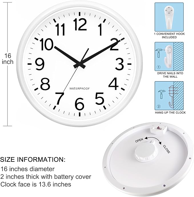- IP67 Waterproof: Sealed clock with waterproof screw-on cover prevents water from entering the mechanism. Perfect Weatherproof clock for hanging bathroom, outside, patio, garden, fence, lanai, garage, poolside, farmhouse, yard or backyard.