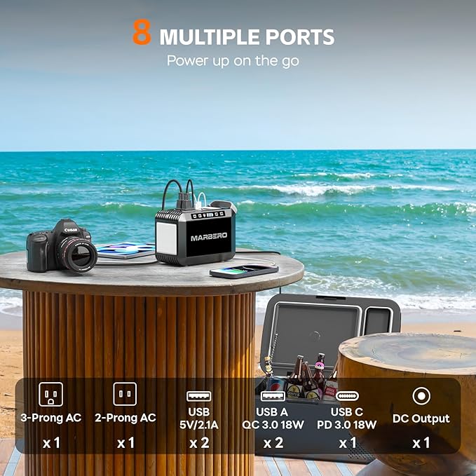 - SOLAR GENERATOR WITH PANELS INCLUDED: The combination of MARBERO portable power station M822S and MARBERO solar panel 40W is ideal for battery backup emergency power supply for home power outage or outdoor camping, travel, trip, RV or any other activities, supplying long lasting power for most of your electronic devices, such as cell phone, laptop, camera, speaker, fan, drone, mini fridge and RV electronic accessories., etc.