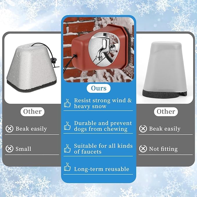 - 【Effective Freeze Protection】: The thick characteristics of the outside faucet cover gives them an edge over normal products, providing better protection against frost, wind, and cold. Outdoor winter spigot covers are designed to help your faucet withstand harsh weather, ensuring it functions effectively even in freezing conditions. In addition, the robust plastic shell not only ensures long-lasting use but also prevents dogs from chewing through the faucet cover.