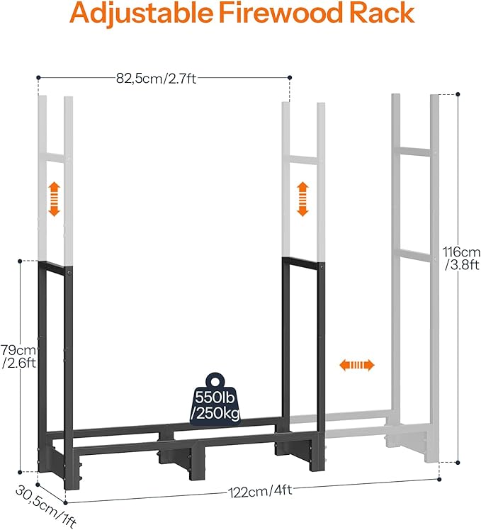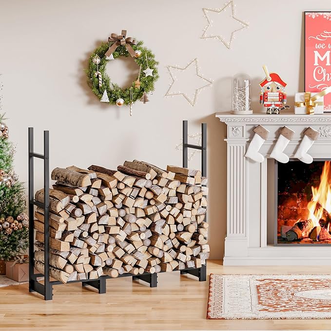 - Adjustable High-Capacity Firewood Rack: Featuring a modular design, this firewood storage holder can be customized in length and height (max: 48"L x 12"W x 45.7"H, holding 1/4 face cord) to fit different spaces and needs, optimizing space utilization