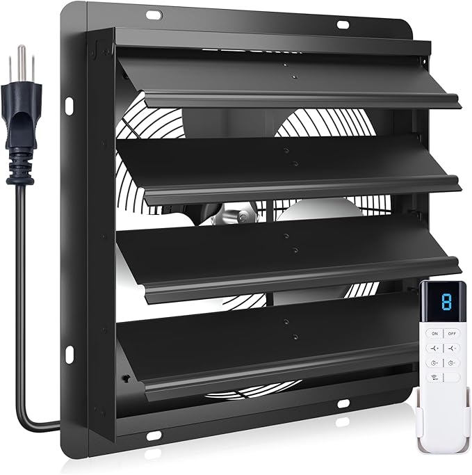 - Shutter Exhaust Fan with Remote: Grille Diameter: 16.94 inches, Louver Size: 14.9 inches x 14.9 inches, Mountable Thickness: 8 inches, Power Cord Length: 6.56 ft, Airflow: 1750 CFPM. Helps you to promote the circulation of air inside the room and purify the air. Stay fresh and stay comfortable!