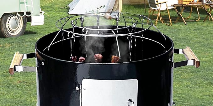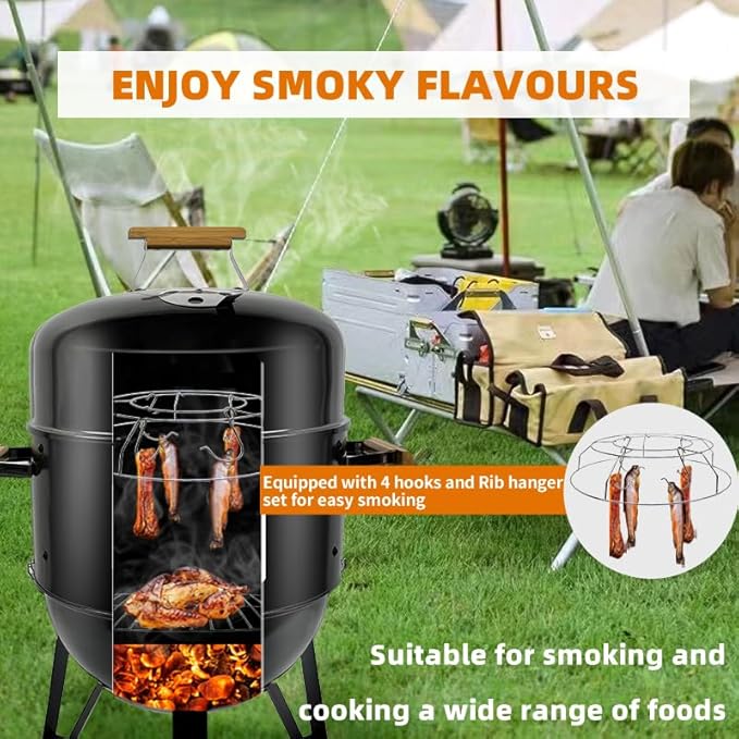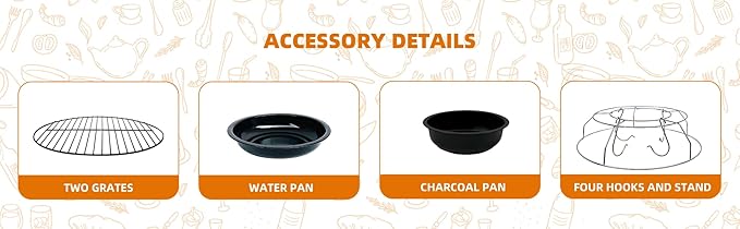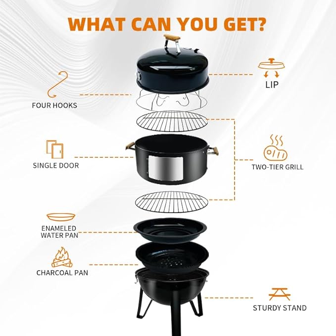 - :Multi-Purpose Grill with 2 pcs grill grates, charcoal pan water pan lid vent and a Rib hanger set with 4PCS hooks for a complete cookout setup