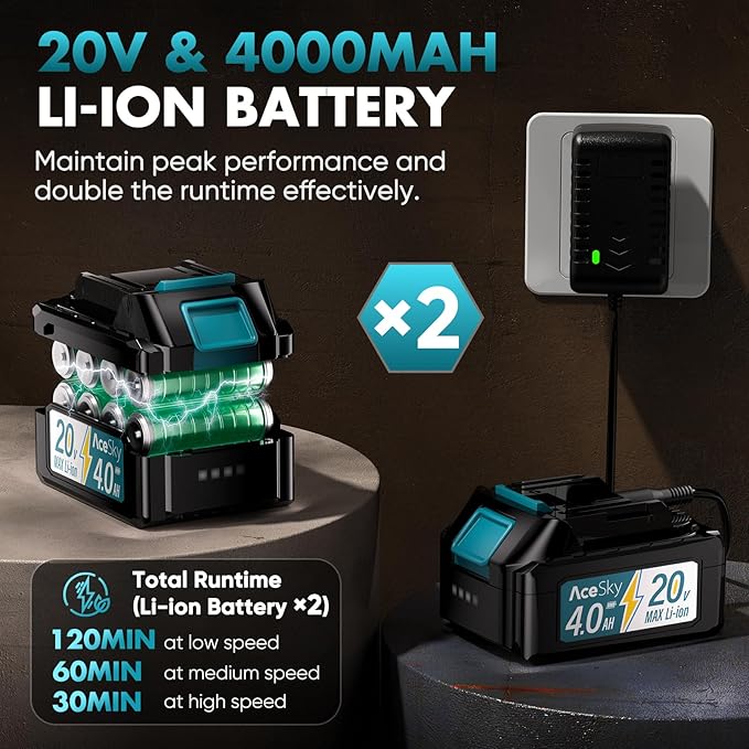 - 🔋【2*4.0AH & 20V Lithium Batteries】Our cordless leaf blower is equipped with Dual 4.0AH lithium batteries, providing up to 120 minutes of runtime in low-speed mode and 30 minutes in high-speed mode. A convenient battery indicator (25%-50%-75%-100%) lets you monitor remaining power and charging progress with ease. Plus, the built-in protection system automatically shuts off the motor and battery, extending their lifespan and ensuring safe,continuous performance for all your outdoor cleaning needs