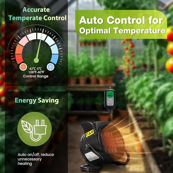 - Energy Efficient: The automatic on/off control in the greenhouse heater for outside winter kit optimizes energy usage, helping you save on electricity costs while maintaining comfort