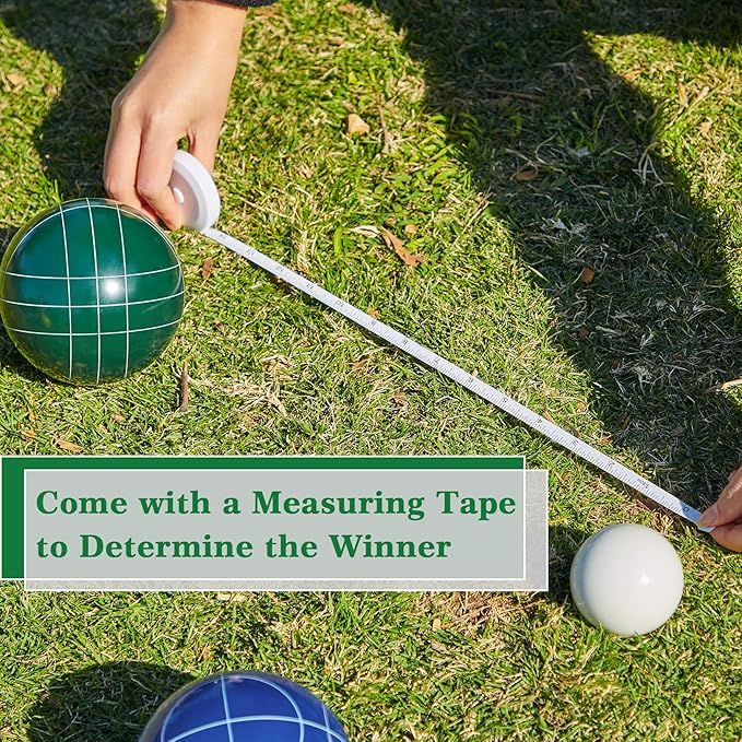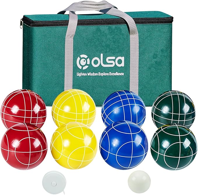 - OLSA Bocce balls set comes with everything you need to play a amazing Bocci outdoor game, includes 8 x 90mm Poly-Resin Balls,1 x 51mm White Pallino, 1 x Oxford Carrying Bag, 1 x Measure Tape, allows 2 to 8 players to enjoy hours of entertainment.