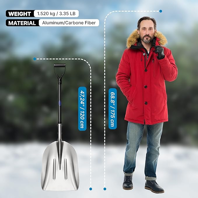 - Lightweight Durability: Crafted with an ultra-light carbon handle and a sturdy aluminum blade, this winter shovel provides exceptional strength and reliability without adding unnecessary weight, making it an ideal shovel for snow removal.