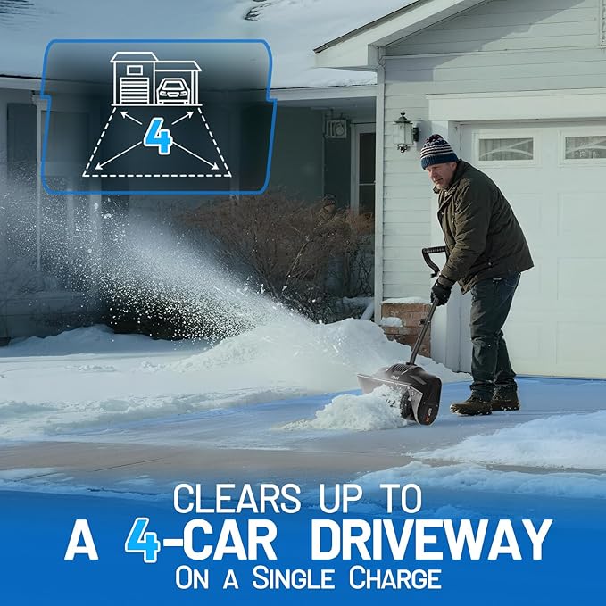 - Quiet Operation: This battery-operated snow shovel delivers powerful performance with low noise, making it an excellent choice for early morning use or residential neighborhoods.