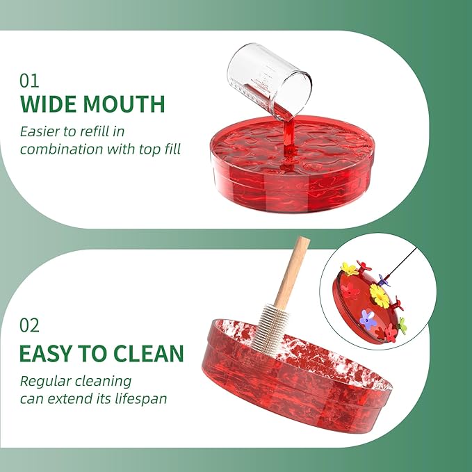 - Wide-Mouth Container: The embedded wide-mouth container allows for quick nectar refills and easy cleaning, ensuring hummingbirds enjoy a continuous supply of fresh nectar.