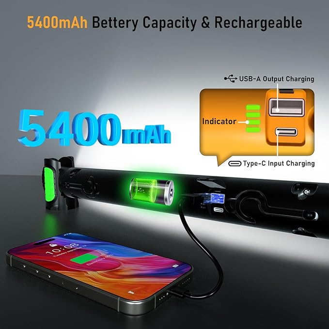 - 【5400mAh Rechargeable & Charging Design】This cordless led work light built-in 5400mAh capacity battery, rechargeable by Type-C input port(5V/2A), saving the cost of extra battery/replace. It can also serve as a USB power bank to charge your phone or speaker device via USB output port(5V/2A). Approx 4Hrs full charging time provides up to 2.5Hrs lighting at high mode and lasts for 8.5Hrs at low. 4-level power indicator allows you to check remaining power and charging status.