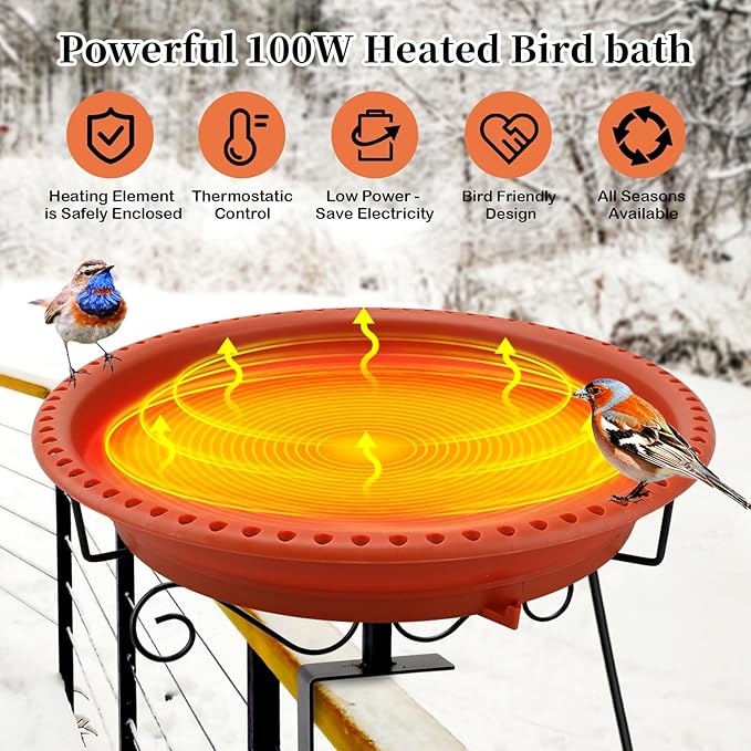 - 【Powerful 100W Heated Bird Bath】 Upgraded heated bird bath built-in 120V 100W heating element that is safely enclosed, power is upgraded to 100W ensures effective deicing, which can help birds survive the winter by keeping the water flowing even in the cold winter months! The flowing water adds charm to your backyard, lawn, and garden; Creating A Joyful Paradise for Feathered Friends During The Winter Months
