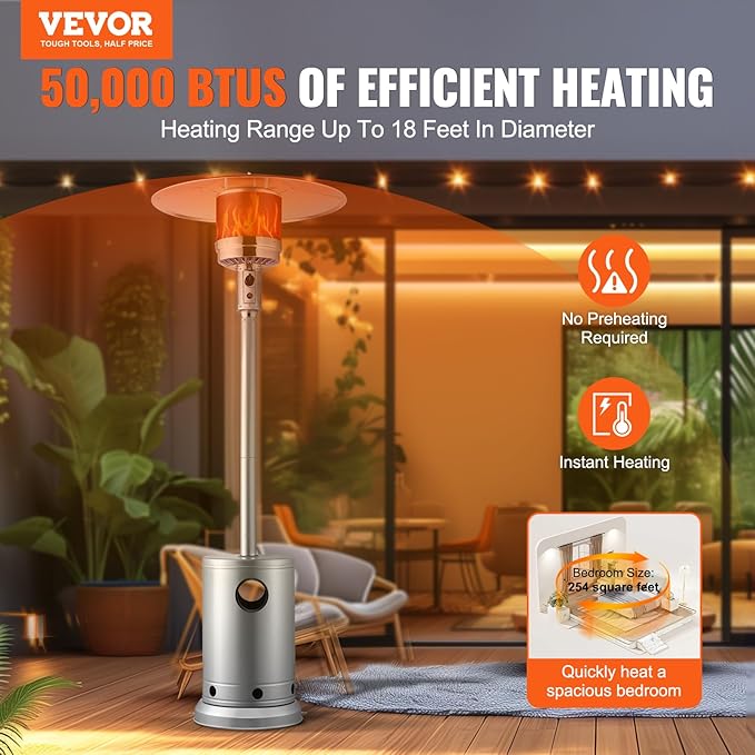 - Lasting Warmth: The VEVOR Fixed Propane Heater outputs 50,000 BTU, spreading heat up to an 18-foot diameter. It operates continuously for 8-10 hours, ensuring everyone stays warm and cozy on cold nights.