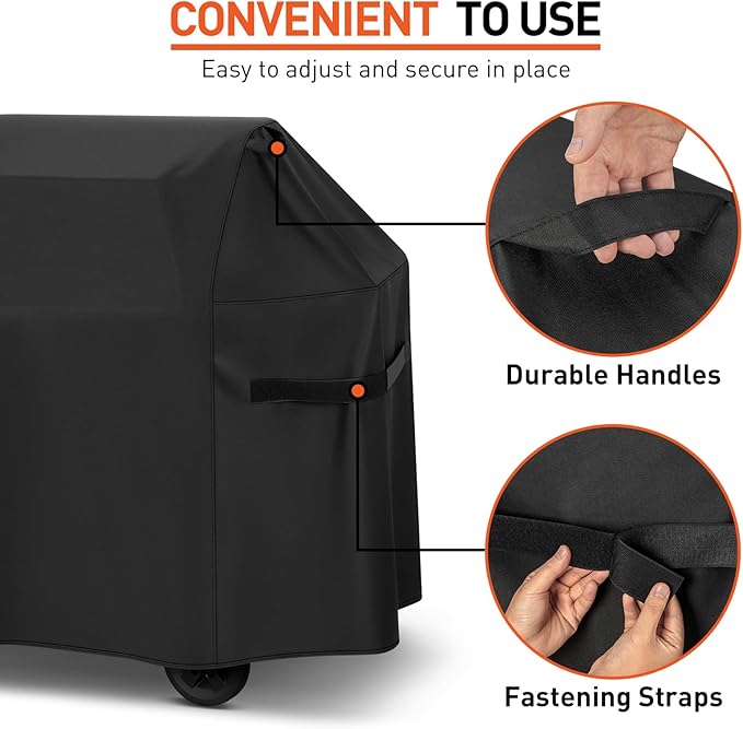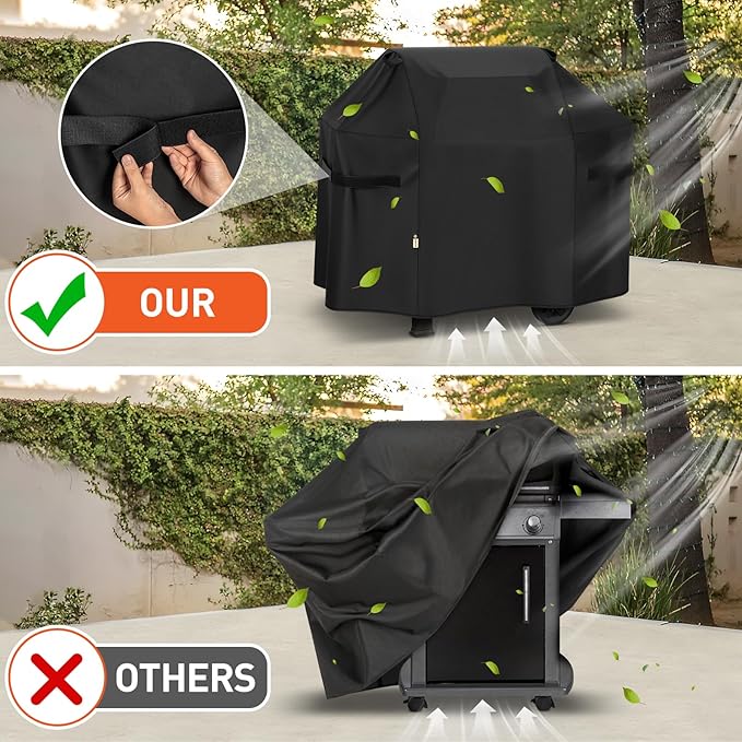 - Secure Fit with Straps : This gas grill cover is designed with convenient handles that make it easy to put on and take off. The adjustable straps ensure a secure fit, holding the grill cover in place and preventing it from slipping or blowing away in high winds
