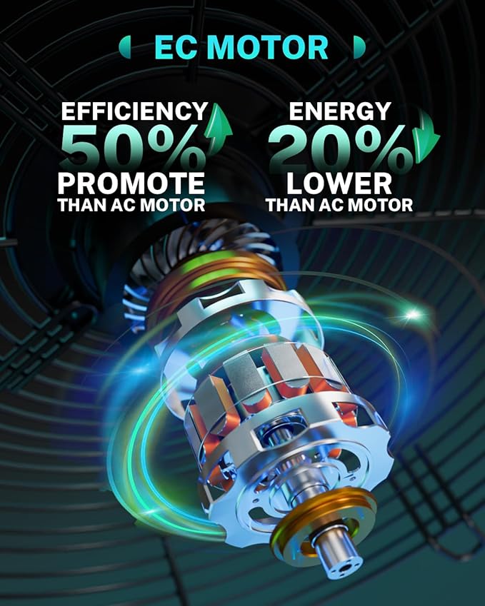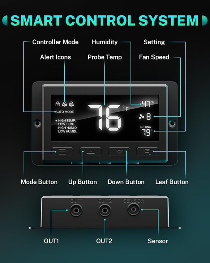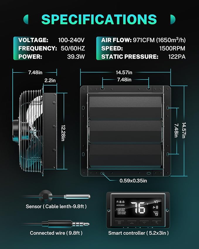 - Smart Thermostat: Equipped with a smart controller, our 12 inch exhaust fan with thermostat allows for precise temperature and humidity management. Set up to 10-level speeds and 9-hour timer to automatically adjust based on environmental changes, ensuring optimal ventilation and energy efficiency.