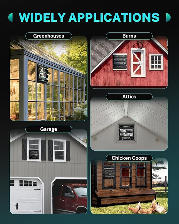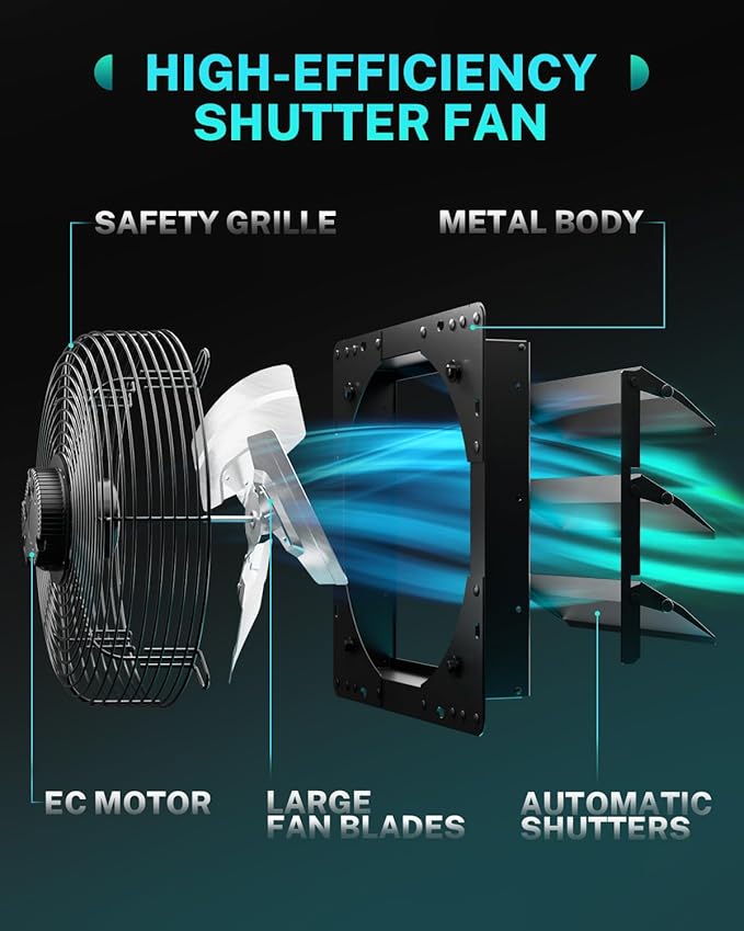- High Performance: Our shutter exhaust fan boasts a robust 971 CFM, making it an ideal solution for efficient ventilation in attics, garages, sheds, and greenhouses. Its powerful EC motor ensures high airflow and low noise operation, perfect for a quiet and comfortable environment.