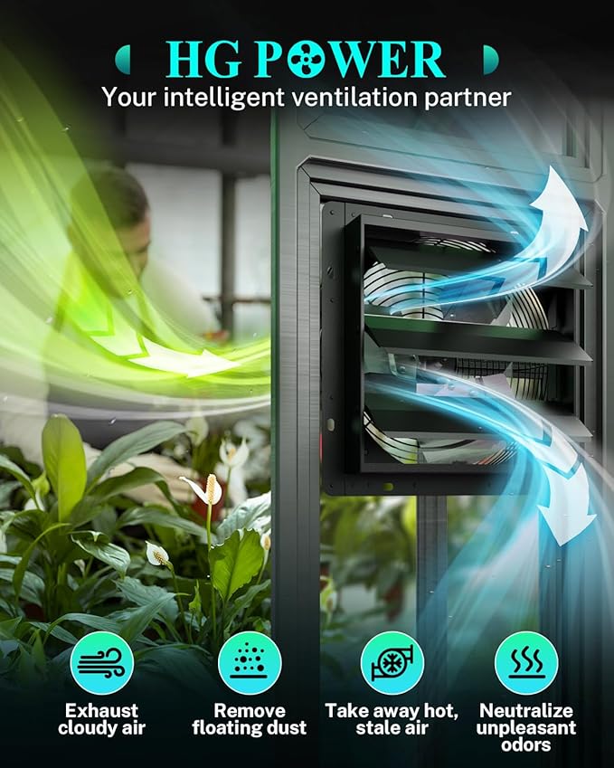 HG Power 12 Inch Attic Fan with Thermostat, 971 CFM Shutter Exhaust Fan with Smart Temperature Humidity Controller, Wall Mounted Greenhouse Fan with EC Motor for Garage, Shed Ventilation, Black