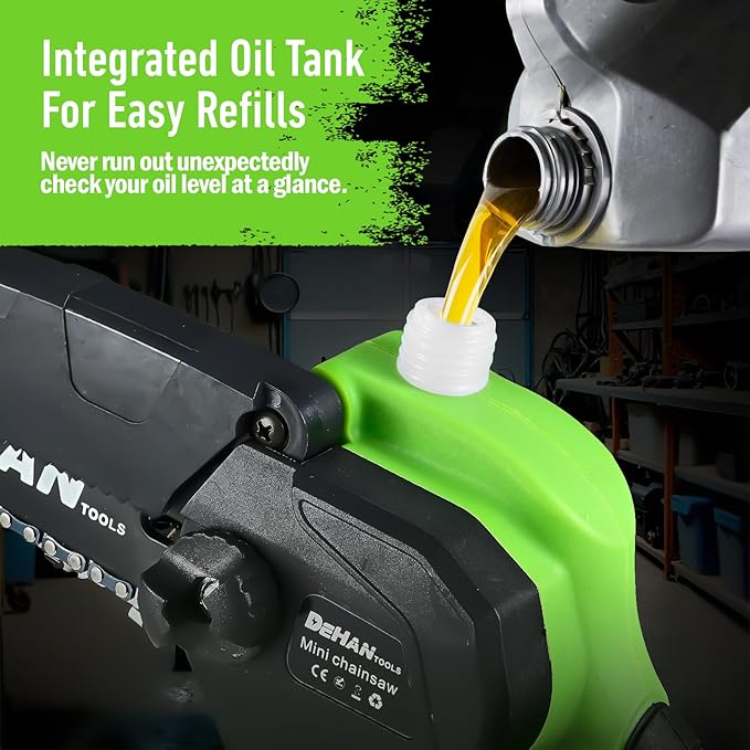 - 【Enhanced Safety & Durability】The DEHANTOOLS mini chainsaw is designed with a dual safety lock and anti-kickback system to prevent accidental starts and ensure safer cutting. Its ergonomic handle provides a secure, non-slip grip for better control. With a built-in auto-oiling system, this chainsaw runs smoothly and stays durable for long-term use.