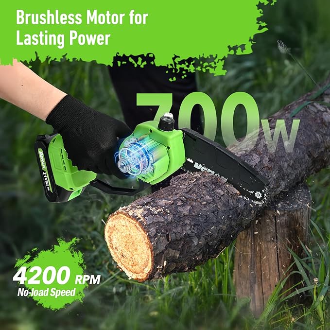 - 【6-Inch Mini Chainsaw】The DEHANTOOLS Cordless Chainsaw is powered by a robust 700W motor and delivers a fast 20 ft/s chain speed, easily cutting through branches and logs up to 6 inches thick. Perfect for trimming, pruning, and small DIY projects—get yard work and home tasks done faster with less effort.