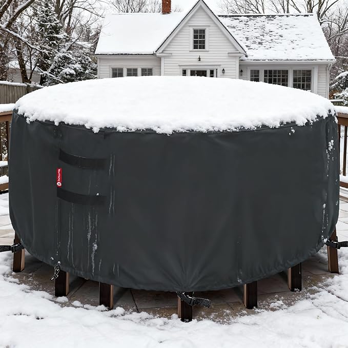 - 【Universal Size】Fits round patio furniture size up to 94"Dia x 28"H. Fits 90-94 inches diameter round patio tables or fits table chairs set. Note: The coverage depends on the size of the furniture set,especially the high of the chairs. Please measure the dimensions of your furniture carefully before purchasing