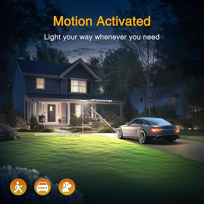 - Enhanced Motion Detection: Max to 180° motion sensor angle, 72.7FT detected distance, 4.64 in installed base diameter, motion delay off time 6s - 60mins. Upgrade PIR motion sensor help you get more accurate detection to activate security lights. Onforu APP will record every time sensor lights trigger on. To get accurate motion sensor detection, 2 options can be set: 3-level sensing distances and 5 surrounding brightness modes to sense and trigger