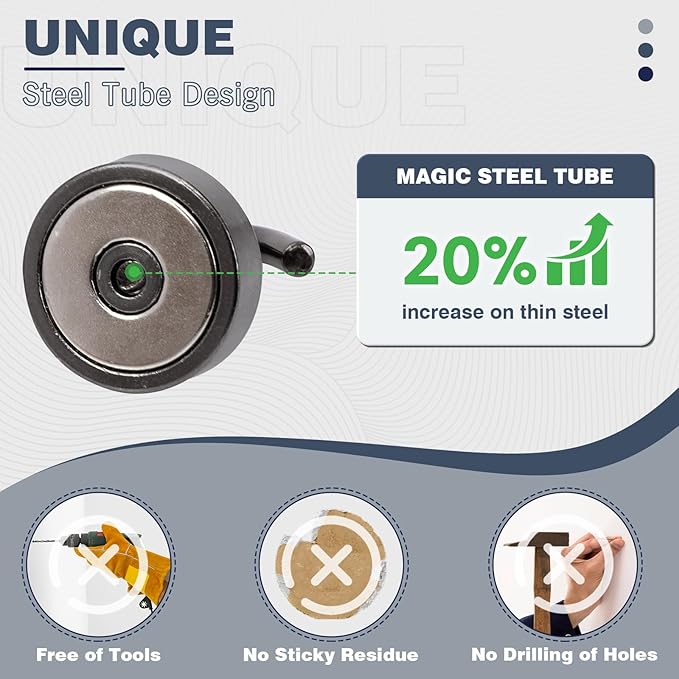 - ✔MAGIC STEEL TUBE DESIGN - Unique design of steel tube inside the base of magnetic hooks greatly increases the attractive force , especially on thin steel! It increase approximately 20% force comparing those none-tube magnets. it solves the problem of weak force on thin steel. Permanent magnetic hook with magic steel tube, strong magnetism lasts forever!